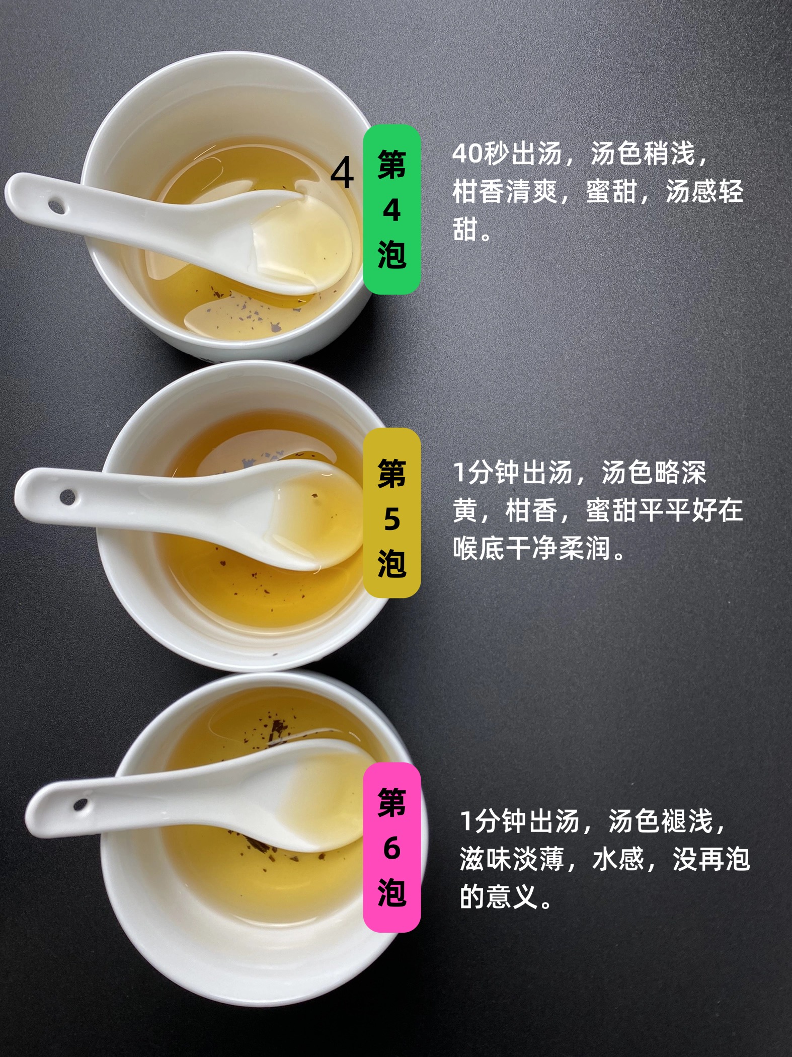 第三泡,30秒出汤,汤色跟上一泡持平,柑香带青,蜜甜,汤感甜柔。