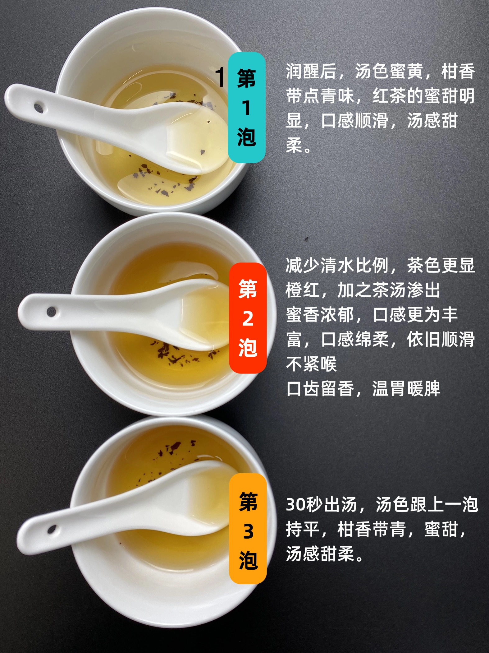 第一泡,润醒后,汤色蜜黄,柑香带点青味,红茶的蜜甜明显,口感顺滑,汤感甜柔。
