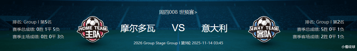 看法:两队近2次交锋摩尔多瓦0胜2负处于绝对下风,意大利进攻端的压制让对手难以招架,历史交锋的优势让其心理优势巨大。而且阵容方面,意大利阵中多名球员效力于欧洲顶级联赛,后防有巴斯托尼,中场有状态稳定的巴雷拉,锋线有雷特吉作为得分保障,实力远在摩尔多瓦之上,意大利为了尽可能刷净胜球,为后续对阵挪威的关键战蓄力,此战战意拉满。而摩尔多瓦球员多效力于中低级别联赛,近期还遭重要伤停,球队6战仅积1分小组垫底,出线已无希望斗志远不如意大利。