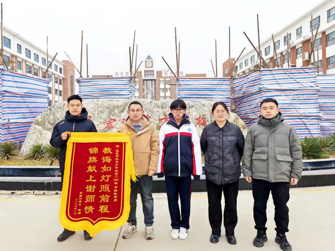在宏达东方学校的校园里,温暖的故事每天都在上演。近日,高二年级 2441 班的申路凯老师,收到了一份沉甸甸的心意——学生彭毅轩及家长送来的锦旗,上面 “教诲如灯照前程,锦旗献上谢师情” 的字样,正是这段师生情最动人的注脚。
