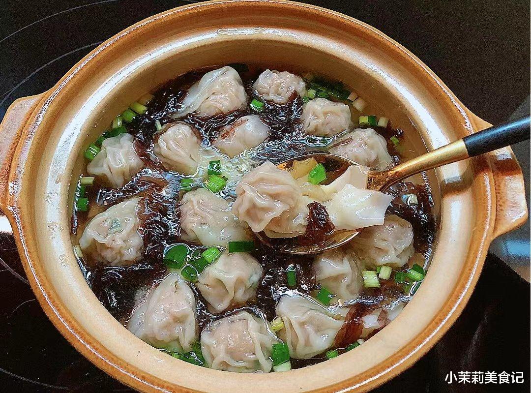 4、锅里添上宽水煮开,将其放进去,三五分钟后彻底熟透。另外撒点紫菜,香菜,葱花,芝麻油,汤汁的味道调好即可出锅。