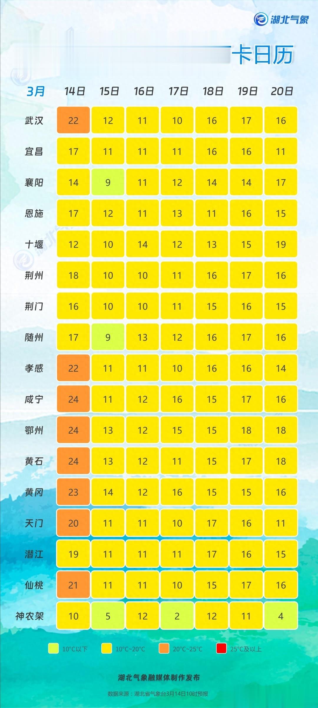 - 14日:鄂西北率先降温,最高温13~18℃;其他地区19~24℃。