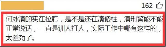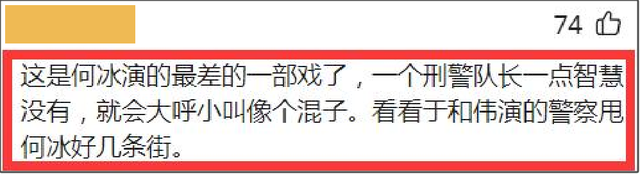 有观众称,在众多何冰参演作品中,此次其饰演的刑警队长角色表现欠佳。