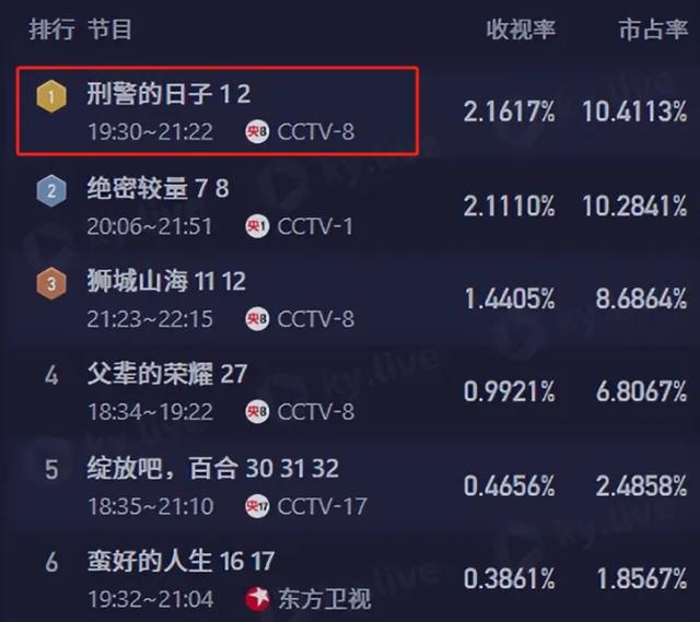 多重有利因素叠加下,《刑警的日子》开播便霸榜前排,首播收视率居全国首位,彰显了该剧的强大吸引力与影响力。