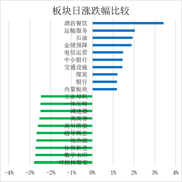 盘面上,酒店餐饮、运输服务、石油、电信运营、银行、交通设施、煤炭、食品饮料、旅游等板块涨幅居前;可控核聚变、数字水印、地热能、超导概念、减速器、一体压铸、工业母机、新型烟草、汽车热管理、时空大数据、算力租赁等板块大跌。