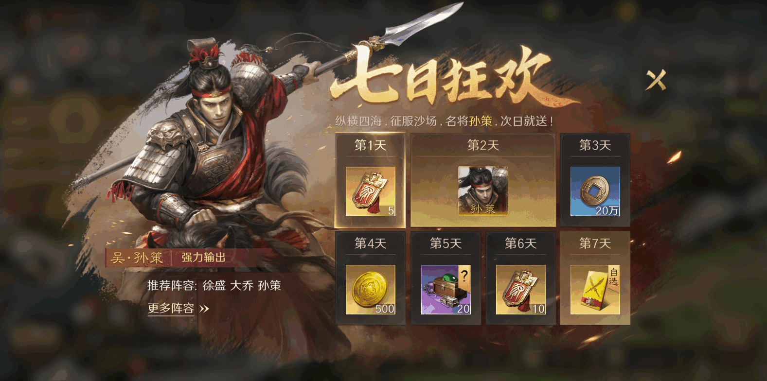 攻城时的预约集结机制更是人性化,设定好时间就能离线参与,再也不用熬夜守点。对于新人玩家来说,福利堪称"焦虑粉碎机"。创角即可领橙将徐盛,次日能得到孙策,七日更是狂送125抽和2480黄金,累计签到还能解锁貂蝉,青玉印兑换高价值道具让资源获取稳稳当当。8%的橙卡概率加上20抽保底,武将等级随意置换、战法重置仅耗铜币,彻底消除了"练错重来"的时间焦虑,让玩家在策略博弈中找回松弛感。