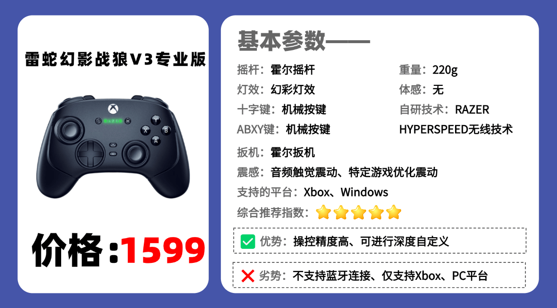 推荐理由:默认摇杆帽是传统的短杆凹面,适合绝大部分游戏。额外提供的高杆凹面,更适合精细控制,个人觉得最适合的场景是防守型射击游戏玩家,如狙击手。霍尔摇杆默认死区偏灵敏,FPS微瞄易过冲,需在APP里手动降一档才稳。以及可自定义摇杆的灵敏度,精细调整的死区优化,手柄的所有按键均采用了Razer的机械微动开关,包括ABXY按键、肩键和扳机键。机械微动虽脆,但扳机锁Pro模式键程过短,轻放手指会二次触发,赛车油门需重新适应深浅。