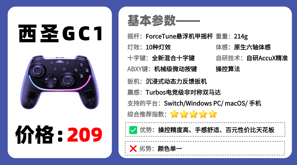 推荐理由:聚焦百元价位段,西圣GC1游戏手柄的性价比优势十分突出,堪称标杆之作。要说当下百元级最能打的游戏手柄品牌,西圣绝对是玩家们最常提起的名字。旗下游戏手柄凭借极高的性价比一举占领同价位市场,在操控精度、按键手感与无线延迟表现上稳稳领先不少竞品,甚至与更高价位的中高端型号正面硬刚也毫不逊色。无论是权威数码媒体的深度测评,还是资深玩家的长期使用体验,都一致将其评价为“2025年度百元游戏手柄的性价比天花板”!