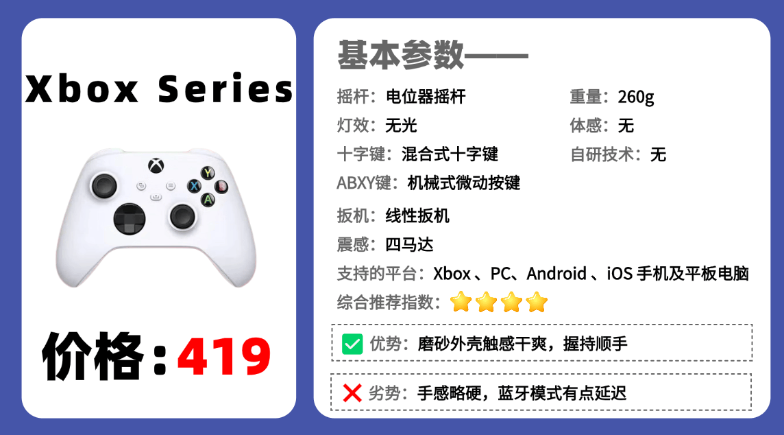 推荐理由:无线控制器的外观真的越看越耐看!简约大气的机身线条搭配细腻的磨砂质感,握在手里扎实又不笨重,边缘过渡圆润,长时间玩《艾尔登法环》《地平线》也不会硌手。标志性的 X box 按键布局太经典了,拇指切换摇杆和十字键时自然顺滑,完全不用适应就能上手,配色选择也丰富,不管是经典黑还是撞色款,都能轻松搭配不同设备。操控体验这个价格里做得还不错,丝滑跟手且精准度都在线;ABXY按键反馈清晰,回弹干脆,按压力度适中,连续触发技能也不费劲;扳机键的行程和压力曲线也比较舒服,唯一小遗憾是握把处没有防滑纹理,出汗多的时候偶尔会有点滑。