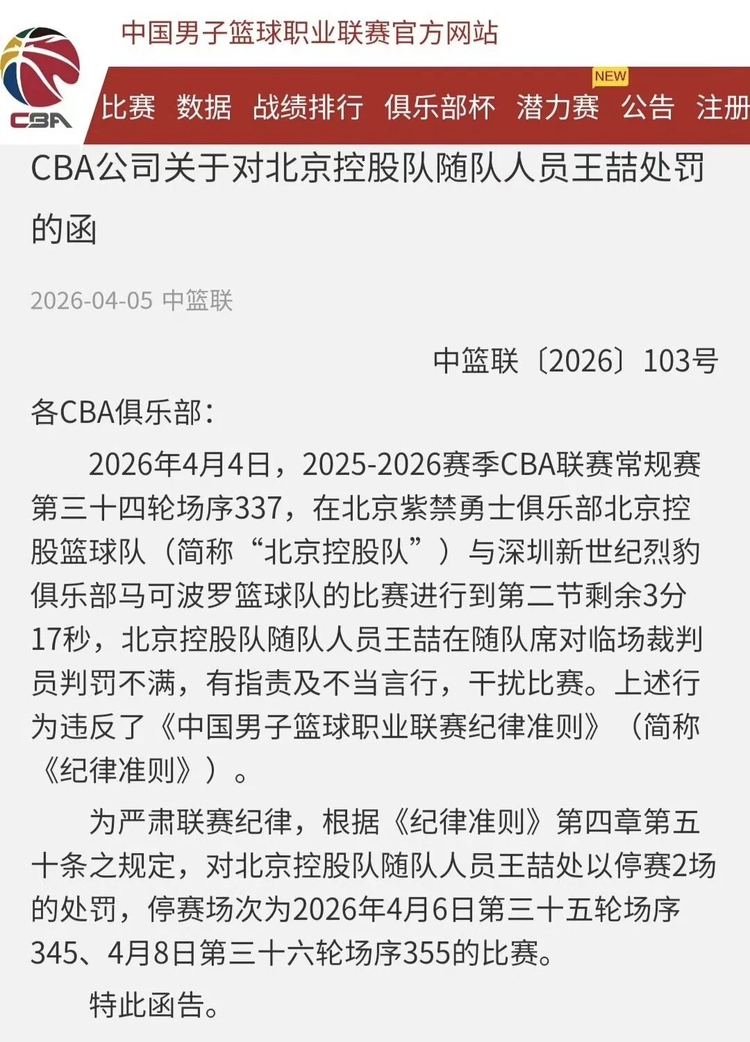 昨晚,随着CBA常规赛第36轮,吉林队大胜四川队、福建队不敌辽篮,故此,除了吉林队、四川队、福建队和辽篮外,其余的16支队伍还剩下最后7场比赛,其中上海队、广厦队、深圳队、山东队、北京队和广东队已经提前锁定了季后赛,上海队和广厦队的夺冠概率领跑全联盟,不过就在此刻,CBA公司突然开出了大罚单。北京时间4月8日,最新消息源报道,在CBA常规赛第34轮,北控队与深圳队的比赛中,北控队随队人员王喆对当值裁判员的判罚不满,有指责及不当言行,干扰比赛,所以CBA公司决定对王喆处以停赛2场的处罚。
