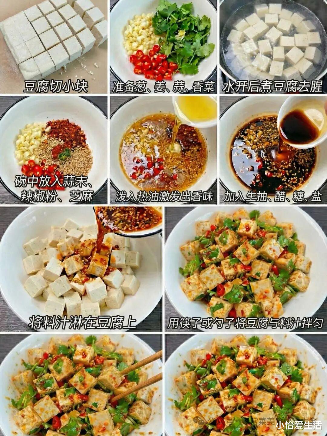 内脂豆腐倒扣脱模,这里有个超绝小技巧:用线代替刀切割豆腐,切口平整还不易碎。切好的豆腐块用凉白开冲一遍,既能去豆腥味,又能让豆腐更挺括。碗中调一碗万能凉拌汁:生抽2勺、香醋1勺、香油半勺、蒜末、小米辣、葱花搅匀,淋在豆腐上,最后撒一把熟芝麻,5分钟就能端上桌!这道菜是江南夏日的餐桌常客,过去没有冰箱的年代,奶奶总会把豆腐泡在井水里镇着,拌上简单的调料,一口下去暑气全消,是刻在记忆里的清爽滋味。
