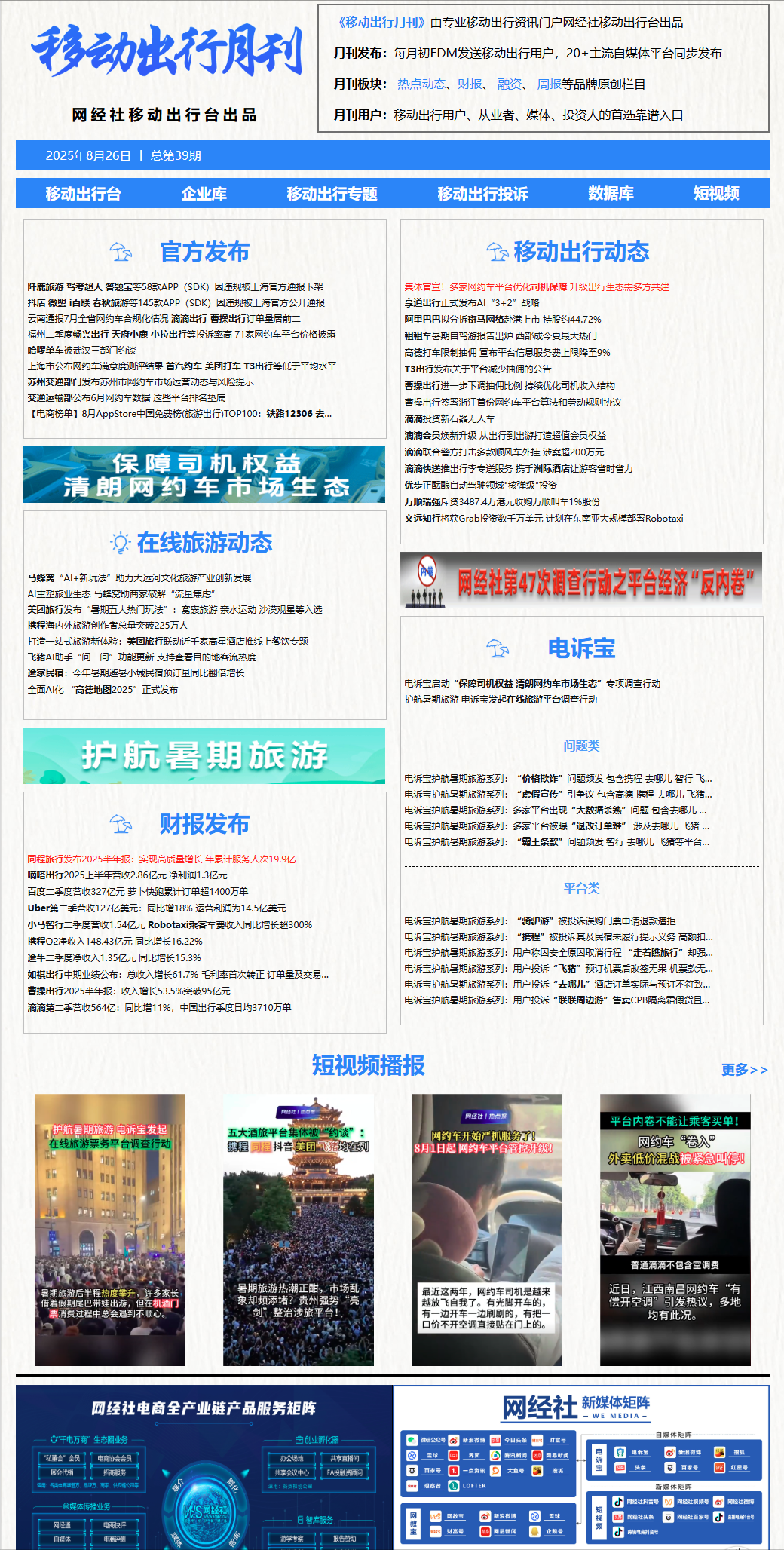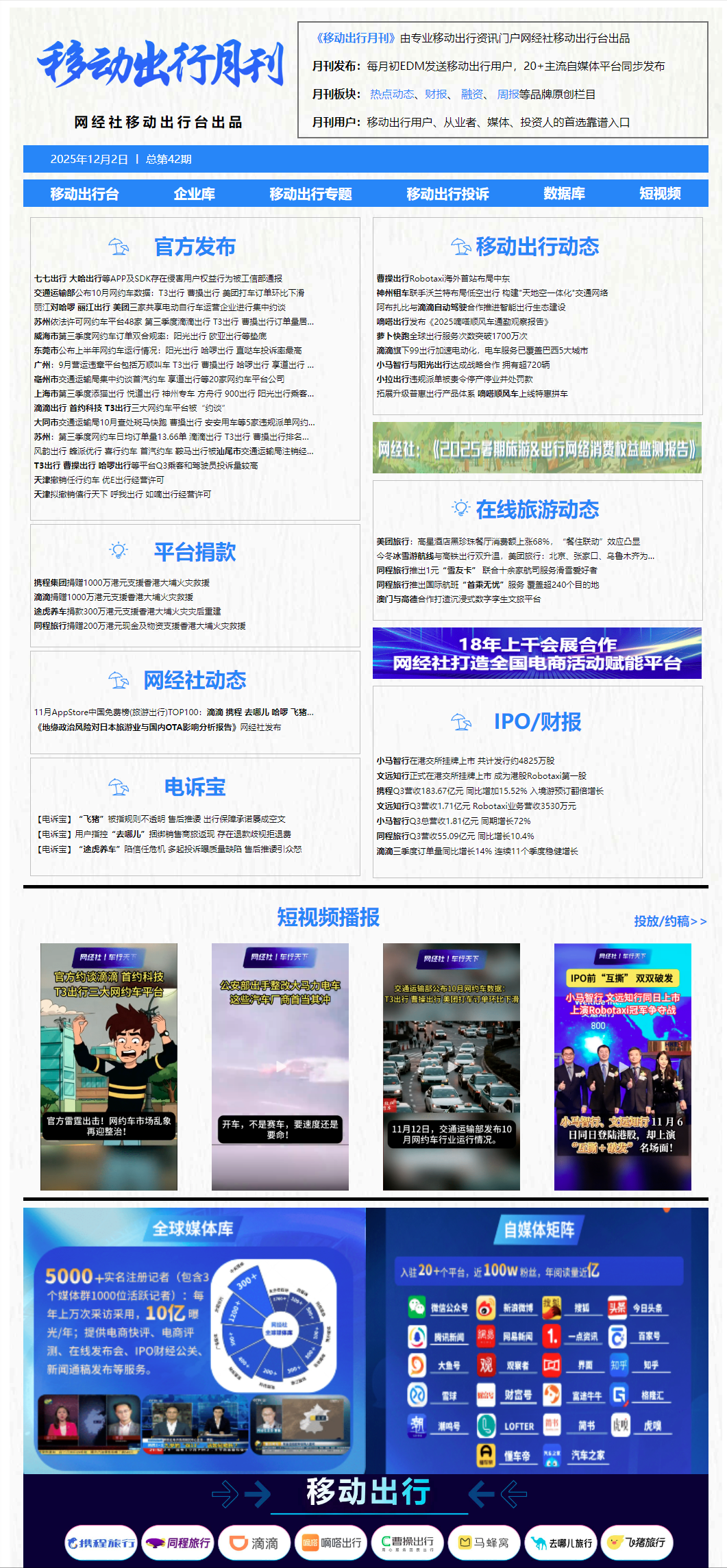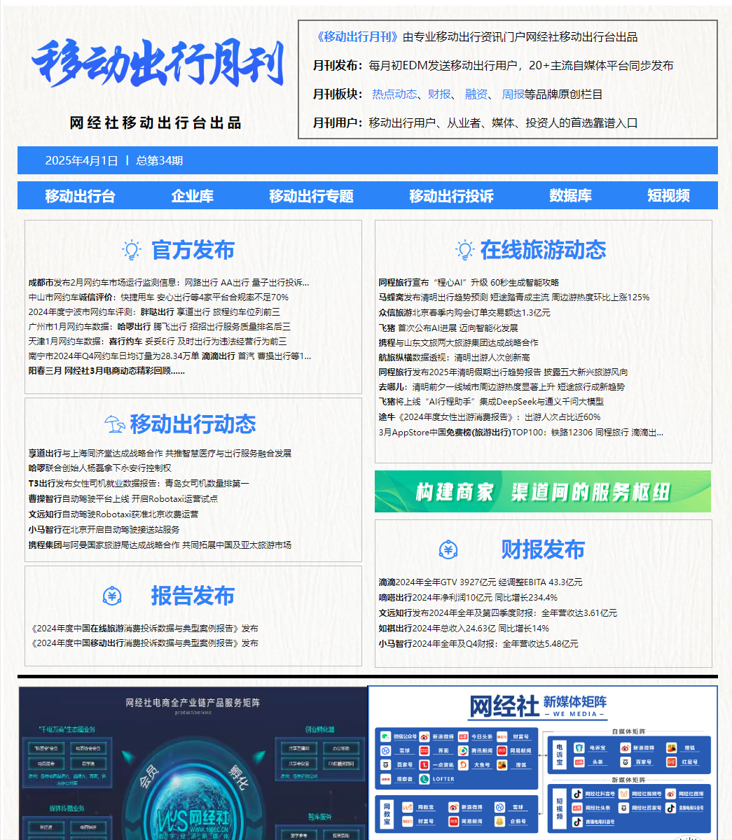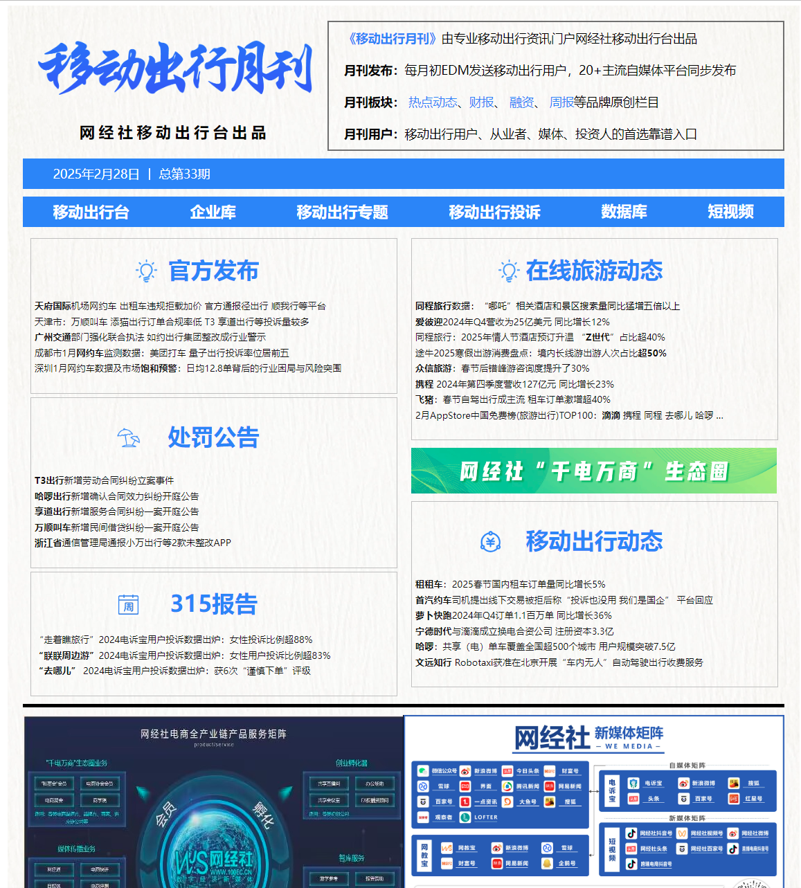 《移动出行月刊》由专业移动出行门户网经社移动出行台出品,面向移动出行从业者的精品内容产品,每月以EDM方式精准发送平台注册高端用户,并在线上长期专题集中展示、备查。