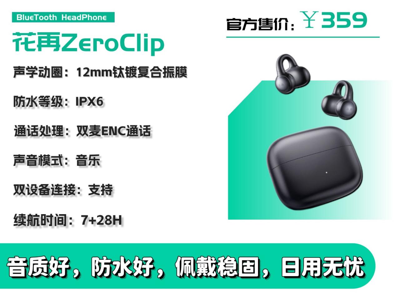 说实话,花再这款耳夹式耳机用下来,觉得性价比也挺高的。先看佩戴,单只 6.3 克的重量看着不算轻,但实际戴在耳朵上完全没累赘感,12 度黄金夹角设计很贴合耳廓曲线,不管是走路还是轻微活动,都不会轻易滑掉,不用总动手调整,稳定性很好。
