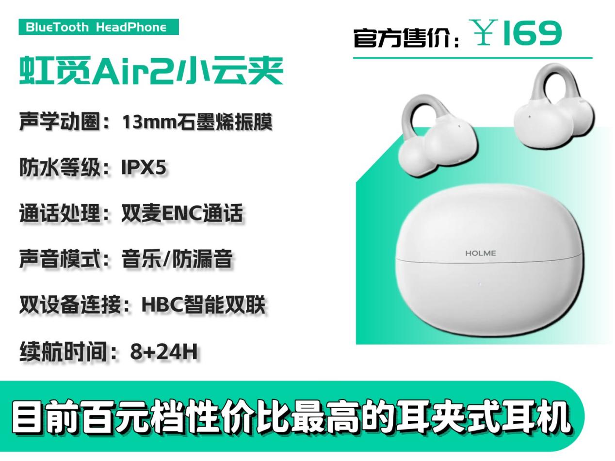 实测好用的耳夹式耳机推荐虹觅HOLME Air2小云夹价格:169 元推荐理由:百元价位中的性能之王,配置和表现都超出预期
