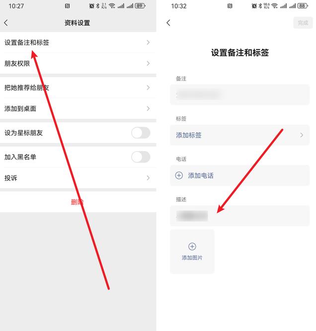 在好友的资料设置界面中找到并点击【设置备注和标签】,然后找到【描述】,输入你想输入的内容即可;