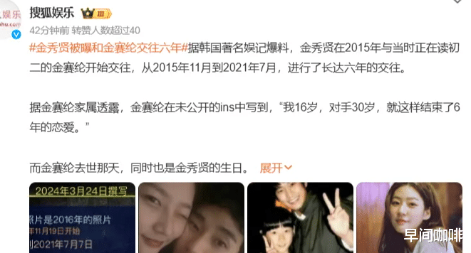 3月10日,韩国知名娱记李镇浩在直播中抛出猛料,称金赛纶生前与金秀贤交往六年,且这段关系始于女方未成年时期——2015年,年仅15岁的金赛纶与27岁的金秀贤开始恋爱,直至2021年分手。更令人震惊的是,金赛纶家属公开指控金秀贤在分手后要求女方偿还7亿韩元债务(约合人民币350万元),直接导致她不堪重压,最终在2025年2月16日(金秀贤生日当天)选择轻生。
