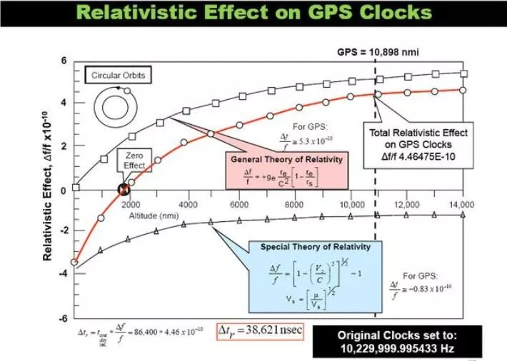 以全球定位系统(GPS)为例,由于定位卫星相对于地面是运动的,且它们在地球引力场中的距离导致时间流逝速度与地面不同,因此必须考虑狭义相对论和广义相对论的效应。