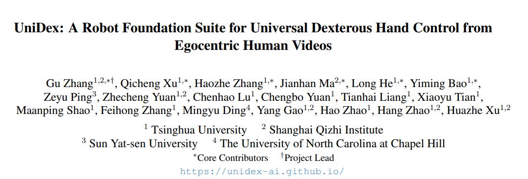 相关论文题目为《UniDex:基于第一人称人类视频的通用灵巧手控制机器人基础套件》(UniDex: A Robot Foundation Suite for Universal Dexterous Hand Control from Egocentric Human Videos)[1],目前已被 CVPR 接收,相关代码、模型均已开源。