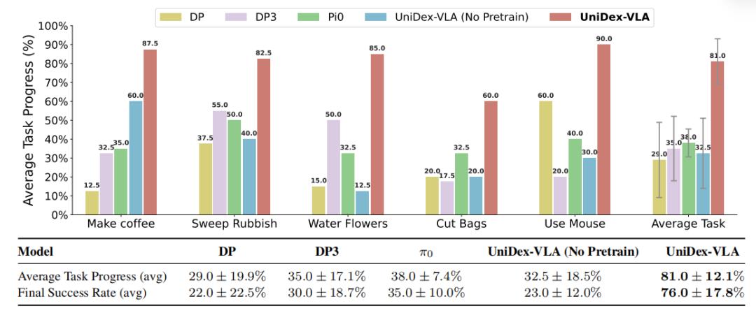 结果显示,相较于扩散策略、3D 扩散策略等基线方法,UniDex-VLA 在所有任务中均取得了优异的平均任务完成进度,最高实现 81%。即便与当前业界具有代表性的 VLA 模型 π0 的 38% 相比,也具有明显的优势。在最难的任务“用剪刀剪袋子”方面,该方法比此前最好的方法提升了 84.6%。