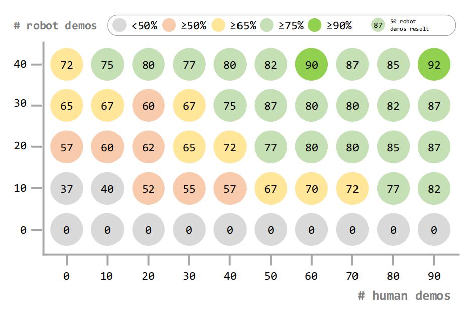 相比传统遥操作方式,UniDex-Cap 采集人类演示的速度提升约 5 倍。在实验中,该团队通过人机数据训练中等难度任务,发现人类演示数据与真实机器人数据比例大概在 2:1 左右,即两条人类演示数据可替代一条真实机器人数据,显著降低了后训练阶段的数据采集和微调的成本。