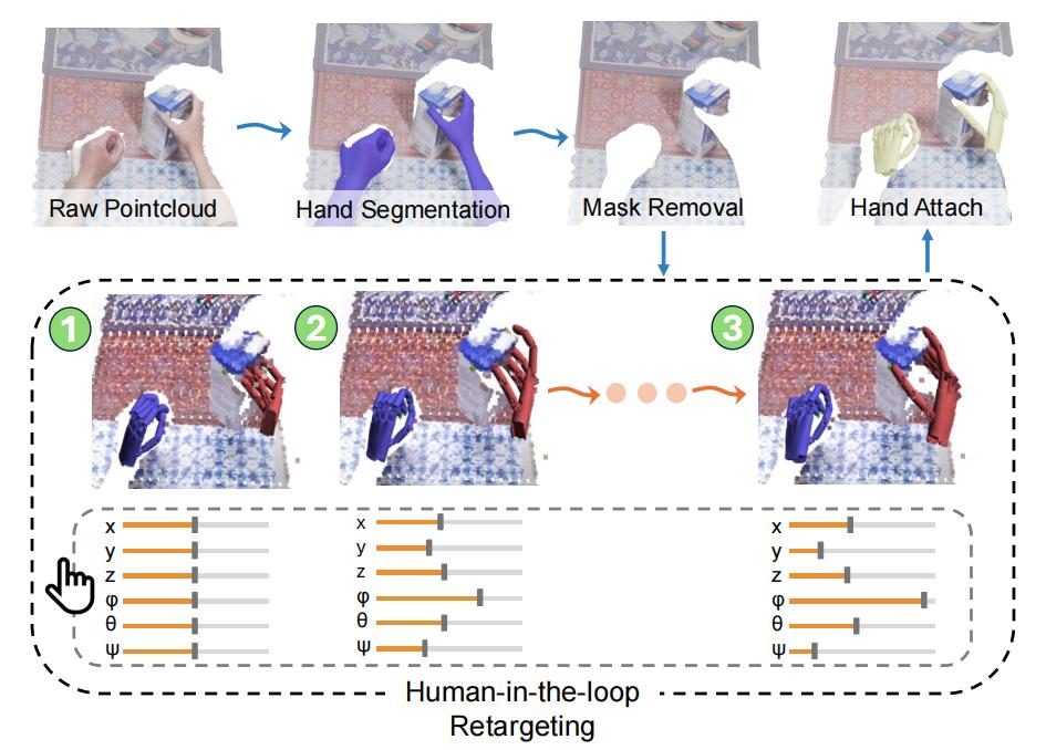 因此,带有三维深度信息的视频数据仅通过第一人称视角即可完成大量操作。同时,三维信息在 human-in-the-loop retargeting 时可辅助更精准的空间位置判断,从而提高转换数据的质量。