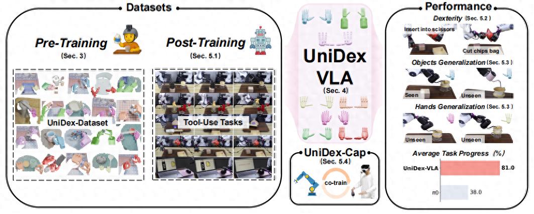 而 UniDex 方法就像让机器人先观察上千个美食博主第一视角录制的视频自学切菜,然后人类再用几分钟纠正一下握刀姿势,结果不仅成本更低,机器人切得比私教效果更好,即便换不同的刀具(不同类型的机械手),也无需重新训练照样可以稳定操作。