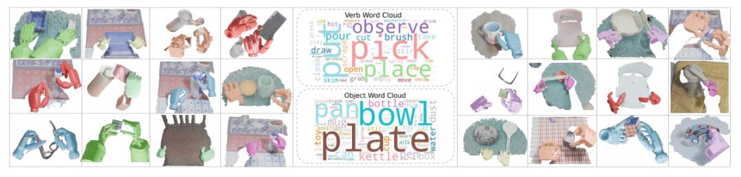 研究团队从四个公开的 RGB-D 人类操作数据集中筛选出涵盖多样场景的第一人称视角的日常任务视频,包括使用手机、开牛奶盒、用铲子翻炒、解魔方等。