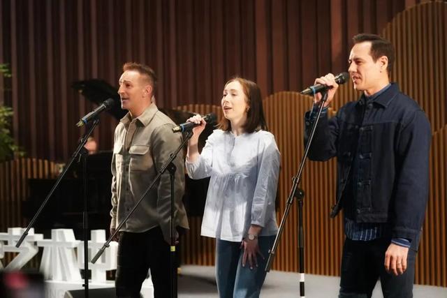 主演格兰特·阿米拉尔(右)、艾米丽·朗厄姆(中)、斯蒂芬·阿内利(左)演唱剧中精彩片段。北京日报客户端 方非摄