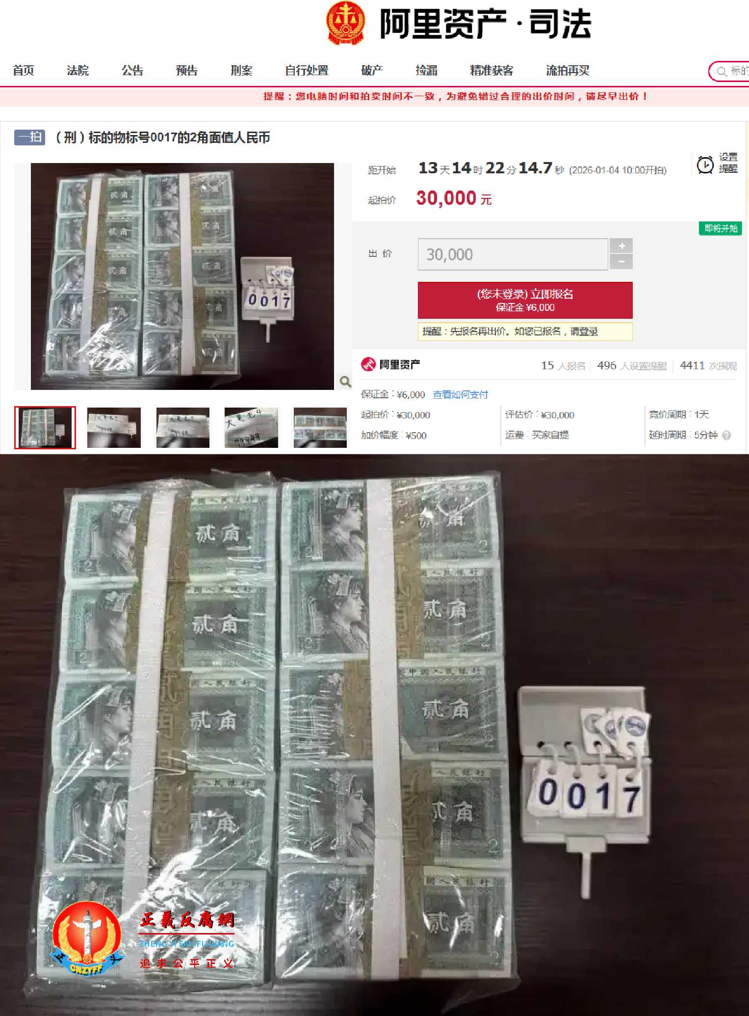 ▲于2026年1月4日10:00开拍,物标号0017的2角面值人民币,起拍价3万元。(图片来源:阿里资产拍卖平台网站 / 截图)