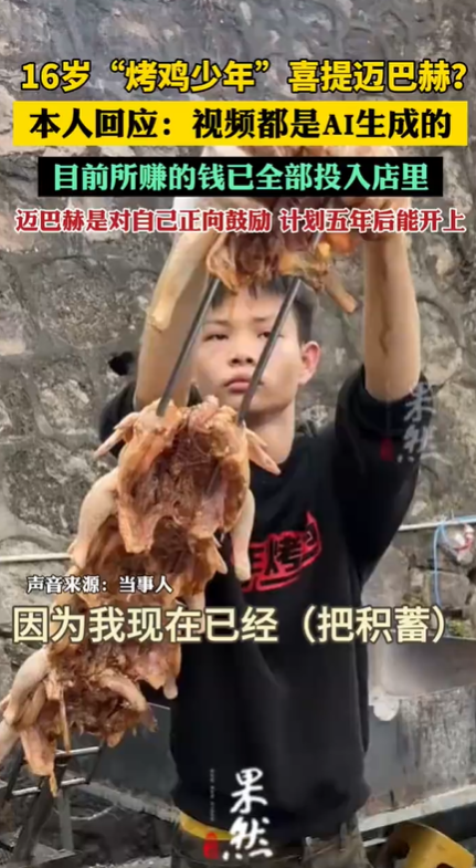 深圳城中村的烟火气里,16岁的林小阳正翻动着烤架上的鸡翅,油滴在炭火上滋滋作响。这位因创业视频走红的"烤鸡少年",近日因网传"喜提迈巴赫"的AI合成视频再次成为焦点。面对镜头,他擦了擦额头的汗珠坦言:"现在赚的每一分钱都投在店铺里,我的真实计划是五年后买第一辆车。"