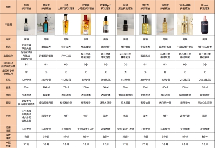下面是我整理的参与此次测评的护发精油产品数据表格