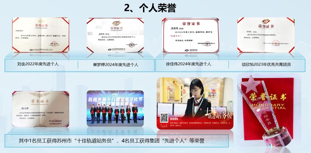 班组深耕服务提质升级,多项关键指标实现突破性跃升,以贴心保障与高效响应为市民出行注入满满幸福感,收获广泛赞誉。班组成员积极奋进,获得多项荣誉,其中一名员工获得苏州市“十佳轨道站务员”称号,成为服务标杆。