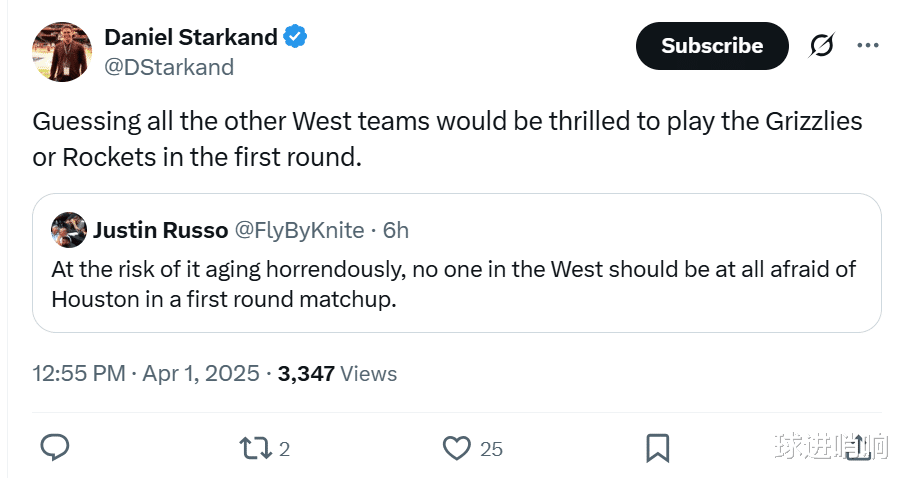 湖人队记Daniel Starkand在湖人击败火箭后就毫不留情指出:“我猜西部其他球队如果在季后赛首轮对阵火箭或者是灰熊,他们将感到非常兴奋!”