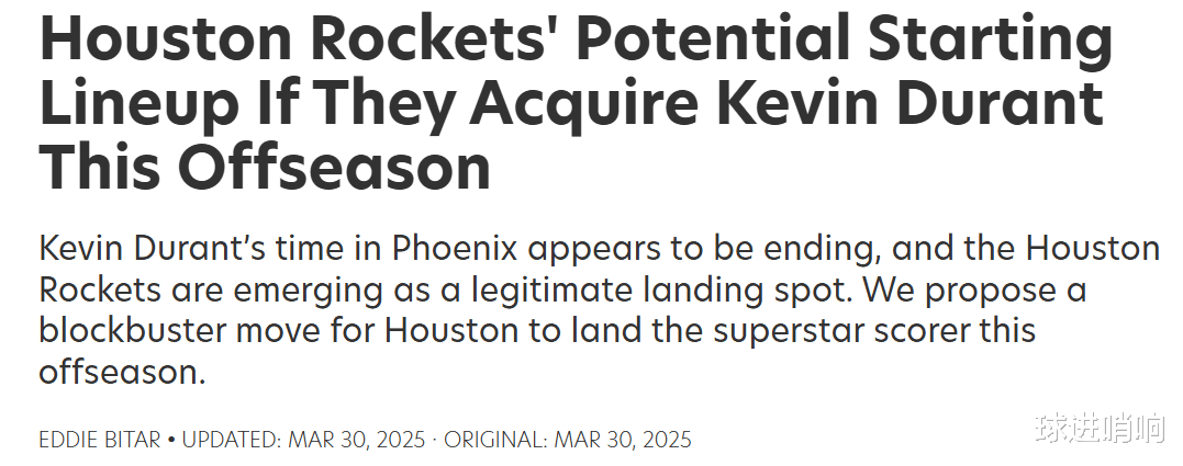 错失赛季第50场胜利,火箭队在面对湖人队的焦点战中暴露致命短板!美媒《fadeawayworld》火速送给休城一笔针对性6换1补强方案,打包卖掉范乔丹、小贾和首轮签交易押宝杜兰特补强关键球能力。