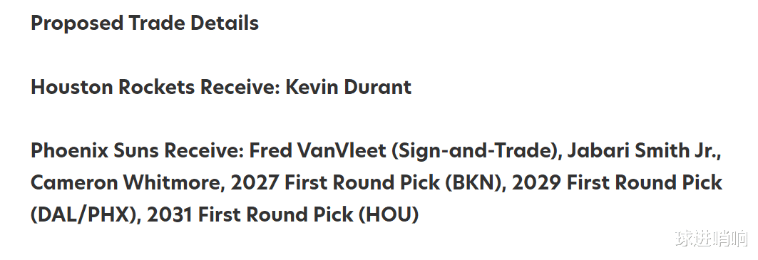 太阳得到:范乔丹+小贾巴里史密斯+惠特摩尔+2027年首轮签(篮网)+2029年首轮签+2031年火箭首轮签。
