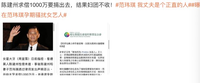 这里有个好笑的小插曲,陈建州在索求赔偿的同时声明将会把这笔钱全部捐给妇女团体,结果妇女救援社会福利事业基金会直接也发了声明稿:我们不要!明确与陈建州划清界限。