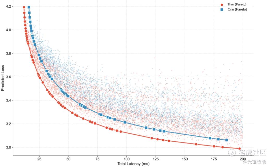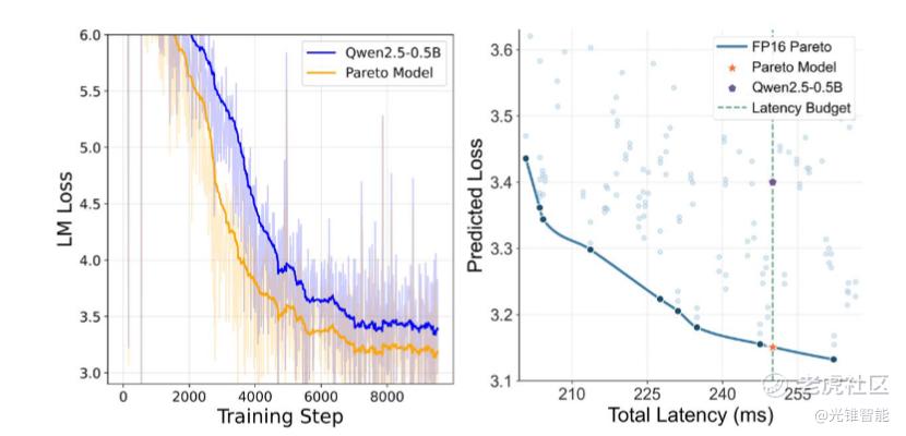在此基础上,结合上述两个式子就诞生了PLAS(帕累托最优LLM架构搜索)框架,从而实现了协同设计。在公式中,只需要输入芯片的算力、带宽、缓存层次,以及工程约束(例如延迟<100ms、功耗、内存),自动生成最优的模型架构方案——找到“在当前硬件上,精度最高、延迟最低的那条边界”。简单来说,就是能同时找到算法能力和芯片设计的共同最优解。