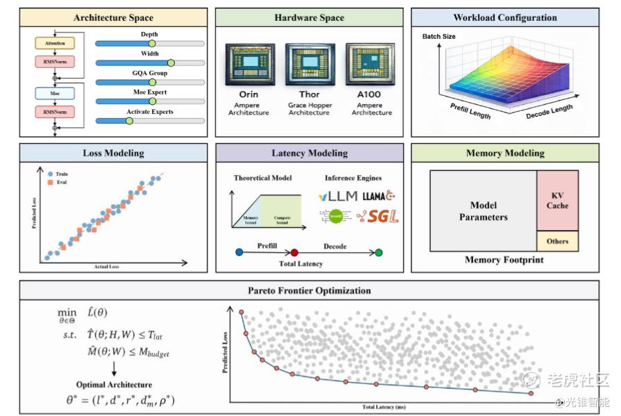 其次,内存子系统设计比算力峰值更重要。论文指出“宽而浅”的最优架构形态表明,内存带宽和缓存效率往往比理论TOPS更能决定系统实际性能。这意味着芯片内存层次设计要随需求变化,例如专门为KV缓存和注意力机制预留足够的高速缓存空间。