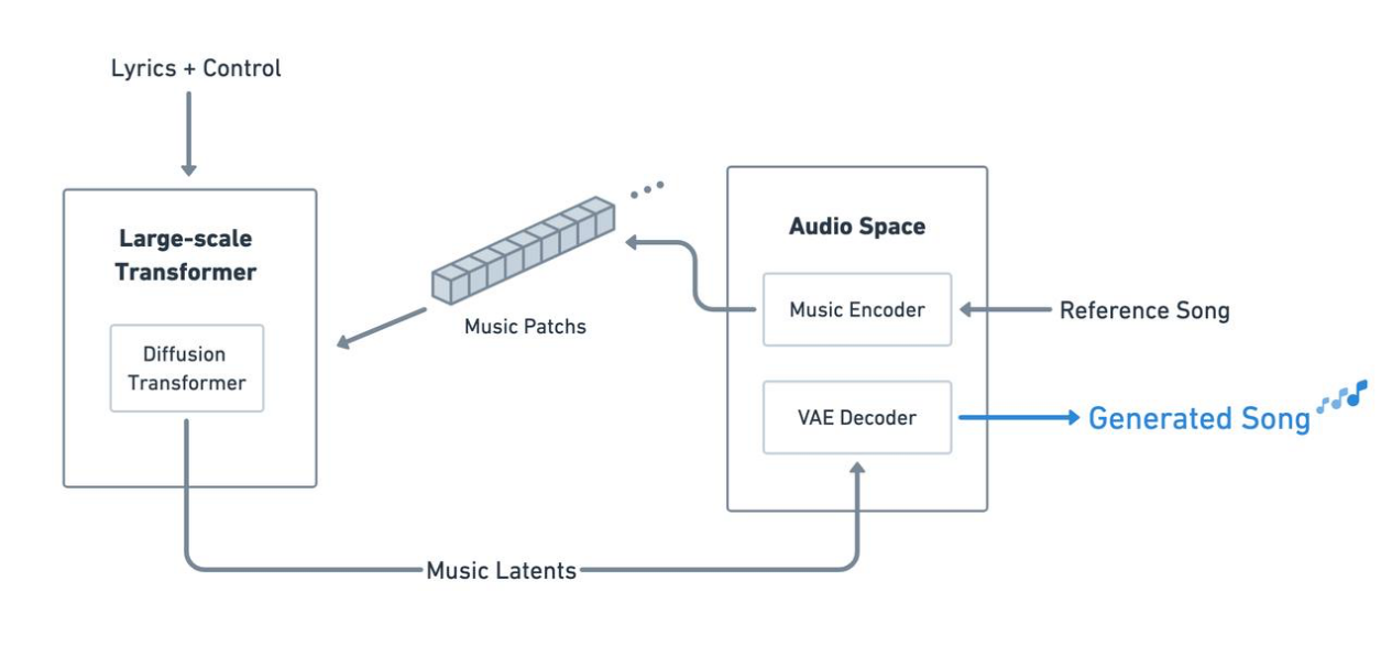 同时,Diffusion Transformer将负责大模型的“演唱”部分,通过LDM(Latent Diffusion Model)扩散模型让Music Patches被还原成成44.1KHz的高品质立体声的音频。