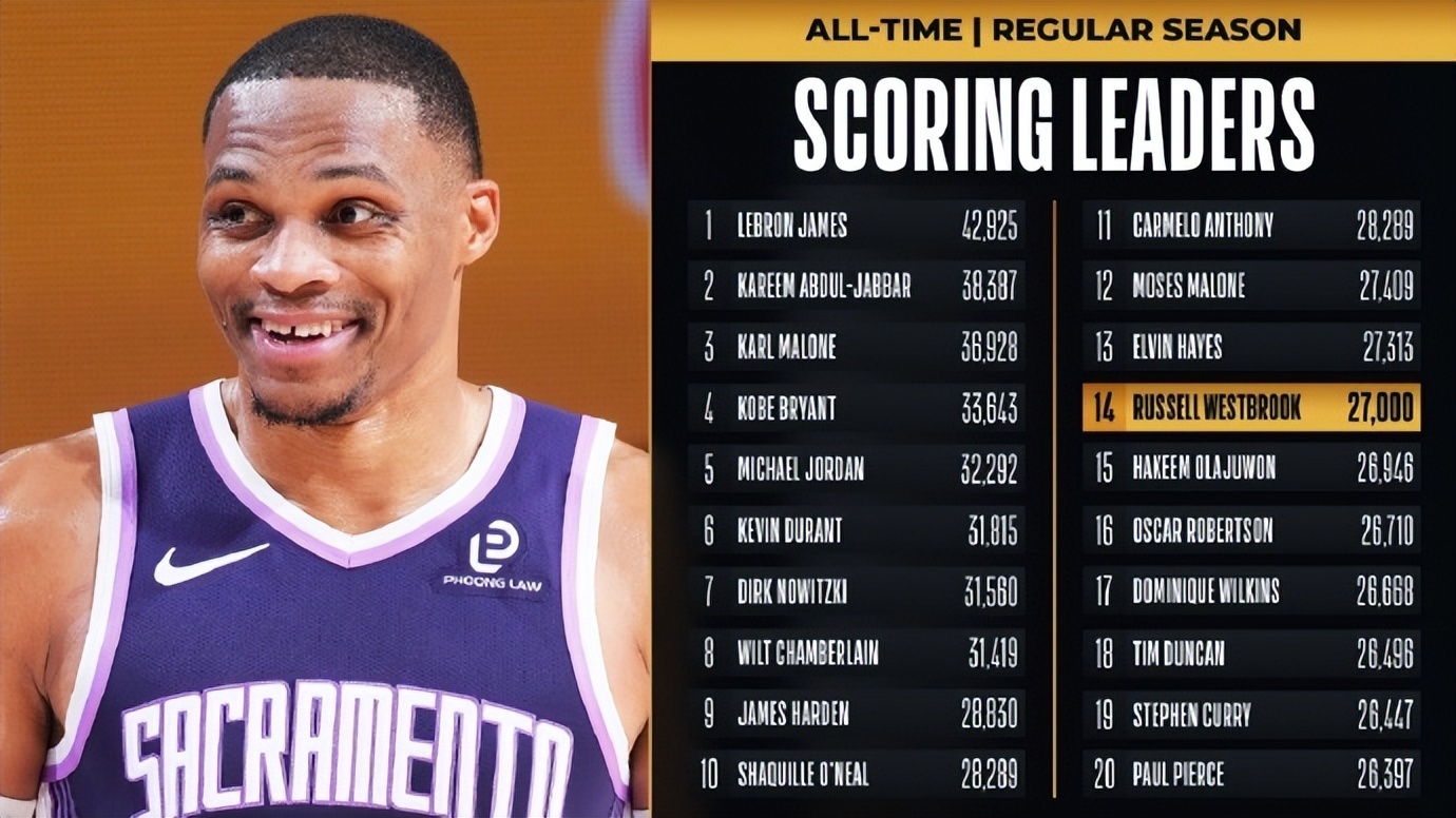 威少也有不错发挥,全场比赛出战21分钟,17投7中,三分6中1,罚球2中2,拿到17分2篮板2助攻。在今天的比赛之后,威少的生涯总得分也突破了27000分大关,成为历史第14位,也是现役继詹姆斯、杜兰特、哈登之后,第四位达成这一里程碑的球员。