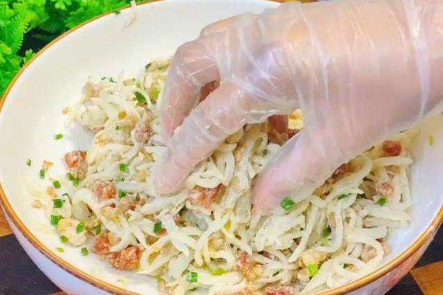 5、炒好后直接倒在萝卜丝里,再加一把葱花,放两大勺淀粉,用手充分地给它抓拌均匀,最后抓拌至可以攥成团就可以了。