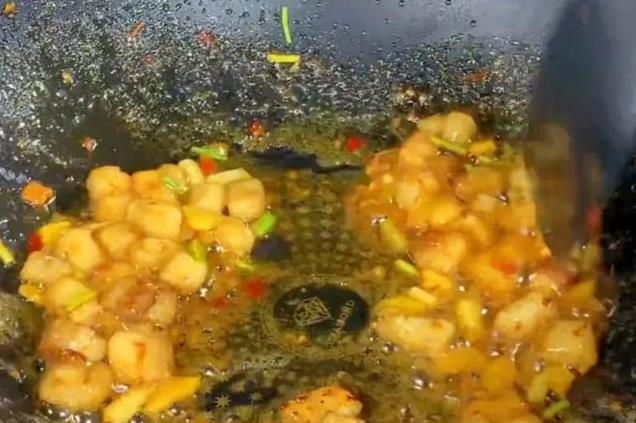 5、时间到了,开大火把汤汁收至浓稠,再把青红辣椒放进去,给它炒至断生,出锅前淋入少许花生油,提亮增香,翻炒均匀就可以出锅装盘了。