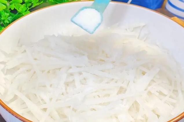 1、准备1个白萝卜,用刀削去外皮,洗干净后,再用刀切成薄片,最后切成细丝,全部放入大碗中,加入2勺食盐,充分地抓拌均匀,放一边腌制5分钟,腌出多余的水分。