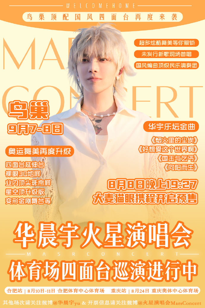 8月24日重庆站、9月7-8日北京鸟巢站,让我们继续追随华晨宇的音乐之旅,感受火星演唱会的无限魅力!