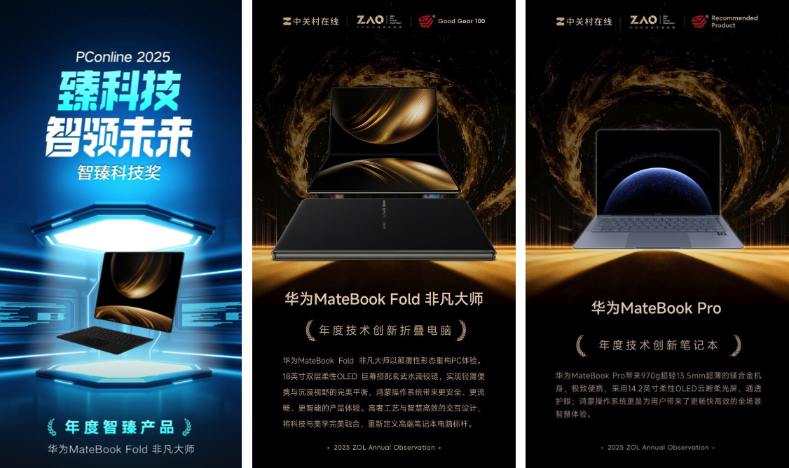 当然,优秀的软件体验离不开强悍的硬件支撑。作为鸿蒙电脑的旗舰代表,华为MateBook Fold 非凡大师和华为MateBook Pro在今年斩获了PConline“年度智臻产品”及中关村在线“年度技术创新”等多项媒体大奖,实至名归。