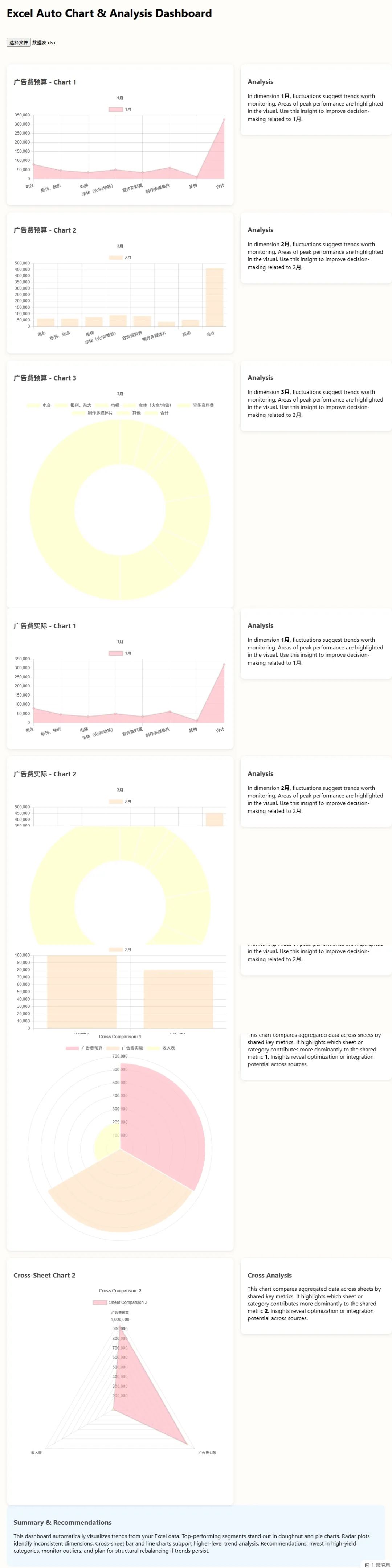 1、对上传的xlsx文件每个工作表内容都要进行分析(若有数据内容),且一个工作表不下于3张图表,对应3个不同维度,数据图表根据内容选择合适的类型,用Chart.js生成数据图表