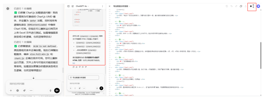 从生成过程上看,GPT-4o响应神速,不到20秒就完成了代码编辑,预览后我发现它图表类型单一,便增加了图表类型多样要求。待它修复后,点击“预览”上传本地xlsx文件后,就看到了如下结果: