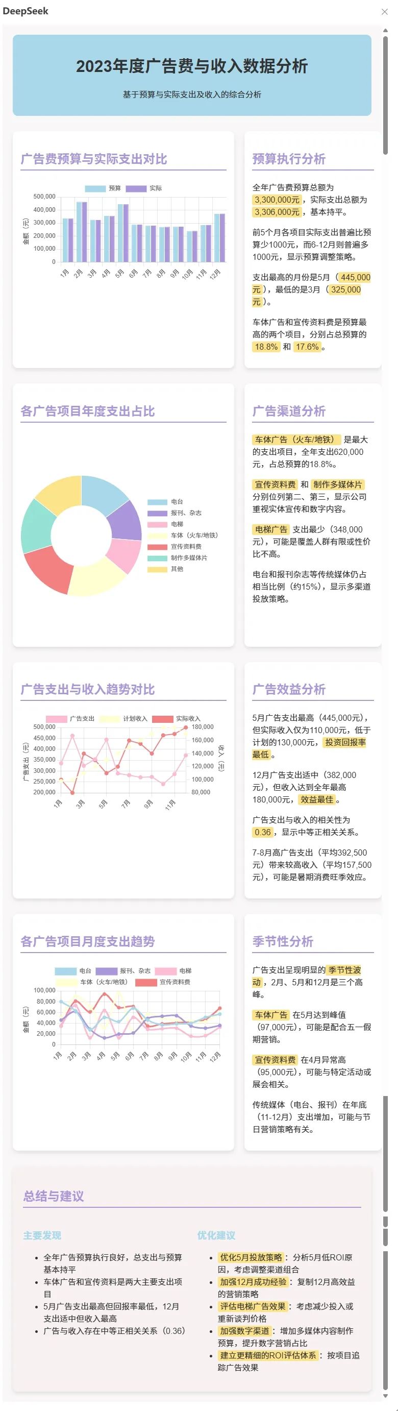 deepseek图表类型多样、美观,分析维度丰富且分析结论是我们想要看到的样子。不过要注意的是,deepseek对公式计算的合计项作图数据会出错,所以在上传附件excel文件之前要将表格全部转换成值的形式。