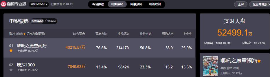 2025年春节档还没结束,中国电影就上演了奇迹,光是一部《哪吒之魔童闹海》就已经砍下52亿元票房,占据了总票房的半壁江山。