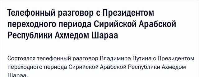 据克里姆林宫官网消息,普京前些日子和叙利亚过渡政府总统朱拉尼通了电话。普京在通话里讲,希望朱拉尼能带着过渡政府把叙利亚碰到的一堆难题都给解决好,让叙利亚老百姓过上好日子。
